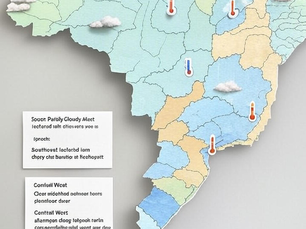 O Centro-Oeste mantém tempo firme, com tardes quentes e máximas de até 40°C em cidades como Cuiabá, e umidade baixa em toda a região, exceto por pancadas fracas perto da divisa de Mato Grosso com o Amazonas.