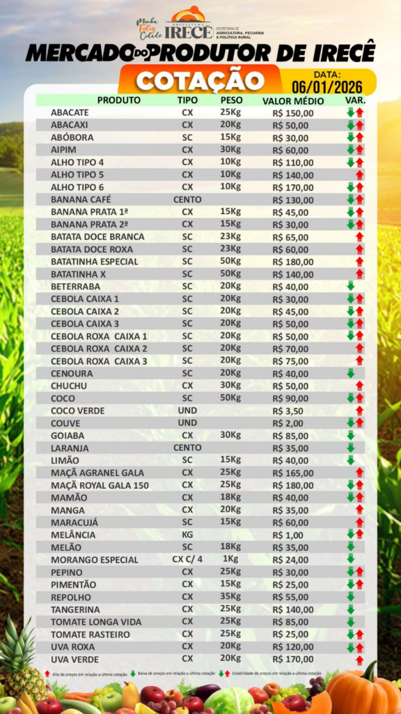 O Mercado Produtor de Irecê divulgou nesta terça-feira, 06 de janeiro de 2026, a cotação atualizada das principais frutas, hortaliças e grãos comercializados na região de Irecê, no Centro-Norte da Bahia. As informações servem como referência estratégica para produtores rurais, feirantes, atacadistas e comerciantes que atuam no abastecimento local e regional.