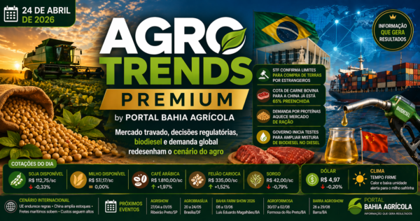 PorIuri Castroabril 24, 2026 11:00Soja sobe com mercado travado, milho pressionado e fertilizantes no radar global no AGRO TRENDS PREMIUM do Portal Bahia Agrícola.
